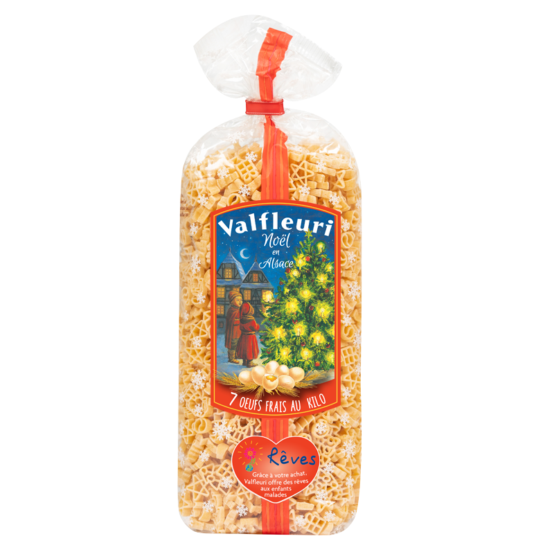 A l’occasion des fêtes, retrouvez comme chaque année depuis 2011, notre assortiment de Pâtes d'Alsace de Noël, dans un joli sachet confiseur ; boules, sapins, étoiles, père Noël et cadeaux. Ces savoureuses pâtes riches en œufs frais sont fabriquées à l’ancienne dans un moule en bronze au design Valfleuri. Une noisette de beurre ou un filet d’huile d’olive suffisent à sublimer leur douce saveur. Elles ajoutent aux plats un clin d’oeil joyeux, pour le plus grand plaisir des petits et des grands.