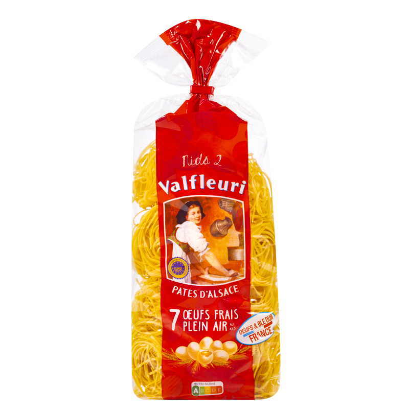 Le Nid 2 Valfleuri est la plus fine des nouilles alsaciennes. Riche de 7 œufs frais au kilo, une noix de beurre lui suffit pour révéler sa saveur raffinée. Ces Pâtes d’Alsace sont parfaitement adaptées pour accompagner des plats délicats à base de poissons ou de crustacées, nappés d’une sauce légère à base de bouillon, crème fleurette, vin blanc ou huile d’olive.